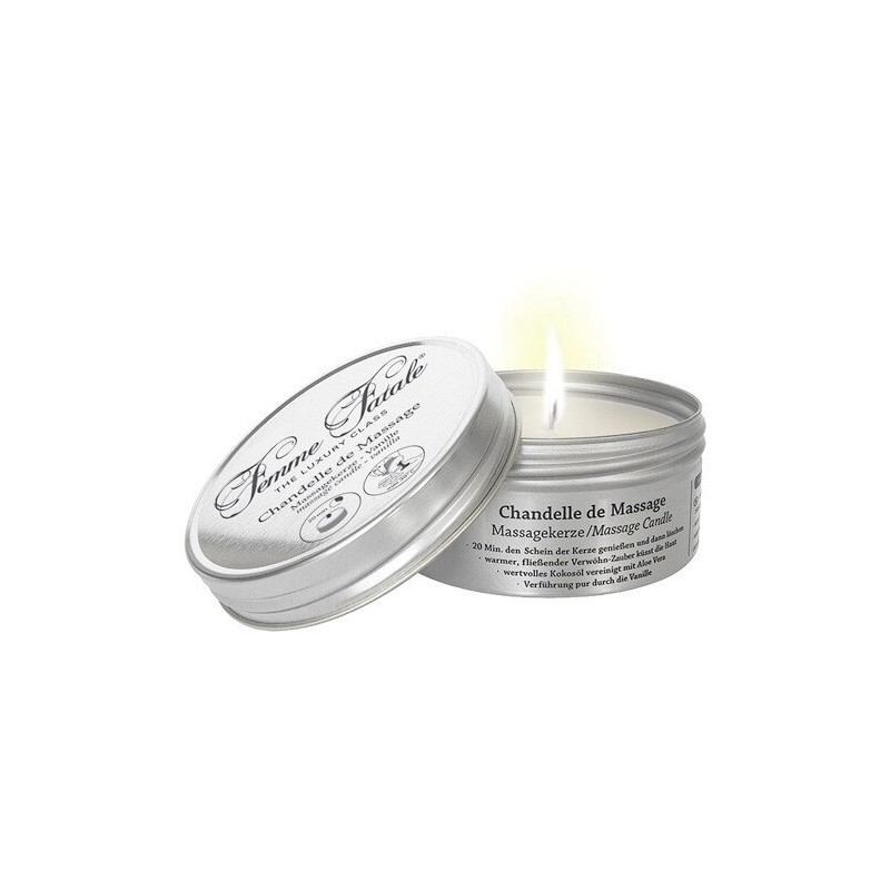 Candela per massaggio al profuma di vaniglia in una scatola decorativa, ricca di olio di cocco e aloe vera.