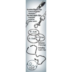 Due capezzolo morsetti su una catena, con allegati 3 anelli del pene intercambiabili su un moschettone.
